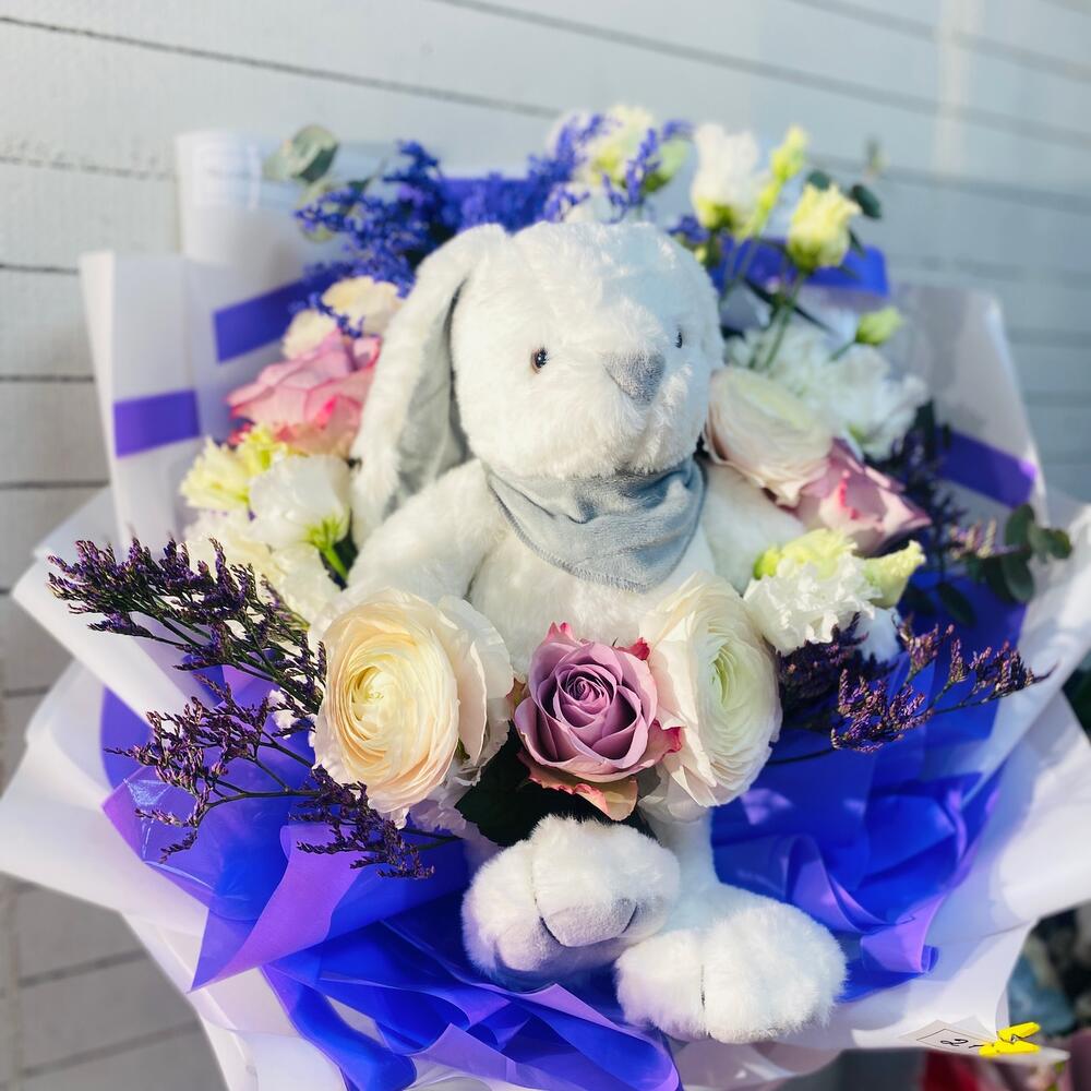 іграшка заєць - 1 шт. Ранункулюс - 3 шт. Эустома - 5 шт. лімоніум - 2 шт. салідаго - 1 шт. евкаліпт - 2 шт. флористичне оформлення - 1 шт. рідина для букета у вазу - 1 шт.